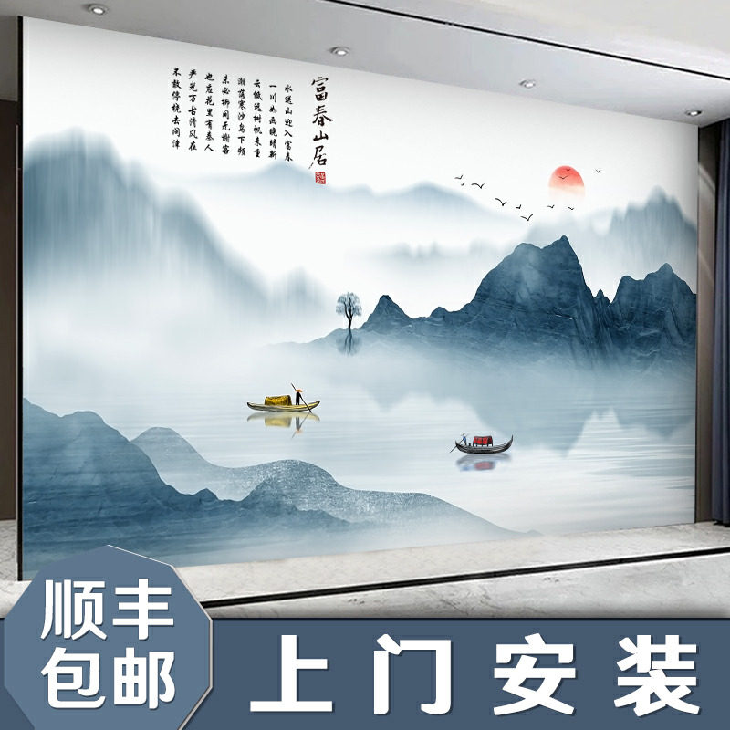 定制8d新中式电视背景墙壁纸现代简约水墨山水壁画影视墙客厅墙。热门设计联盟服务商