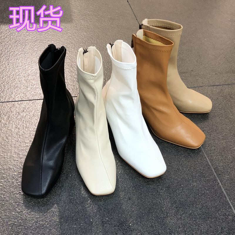 现货 韩国东大门女靴21秋冬网红款方头个性拼接拉链粗高跟短靴热门设计联盟服务商